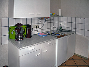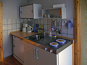 - einen Küchenbereich mit Kochmöglichkeit, Kühlschrank, Toaster und Kaffeemaschine